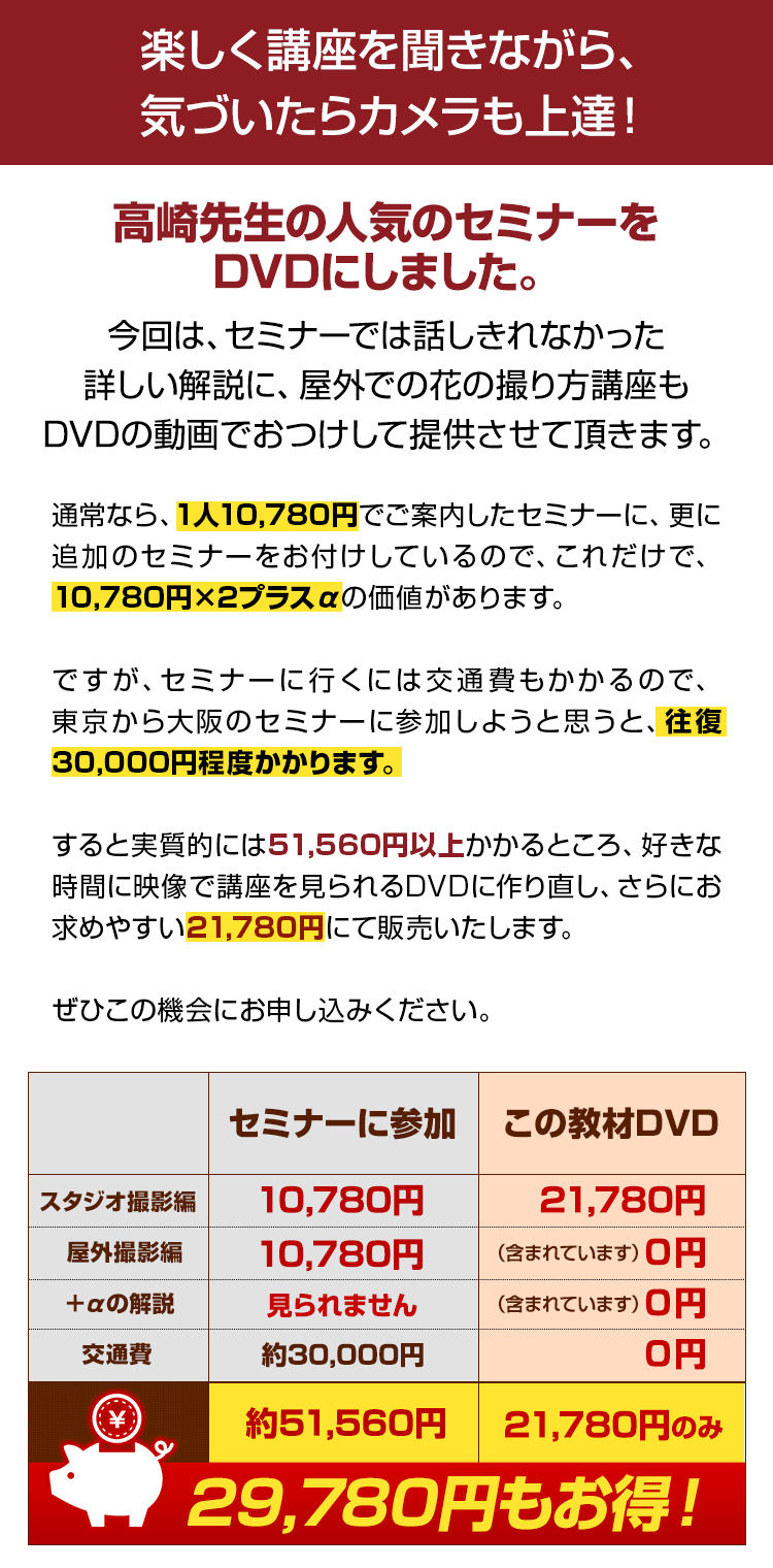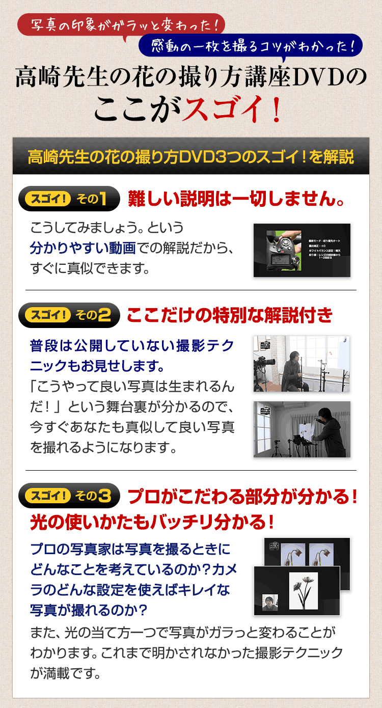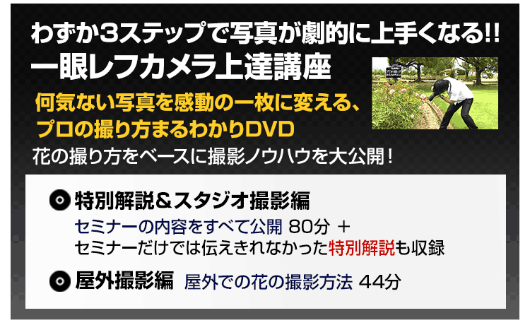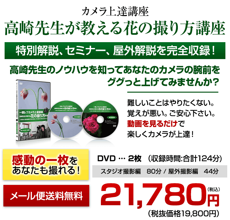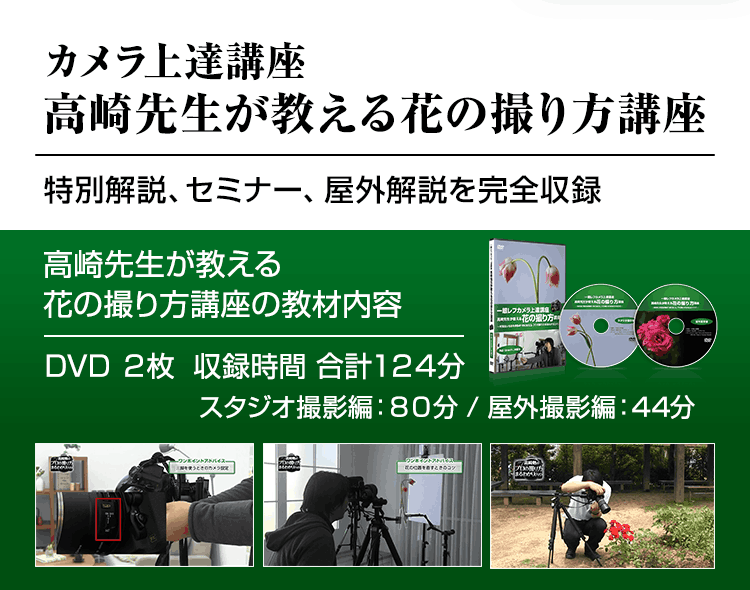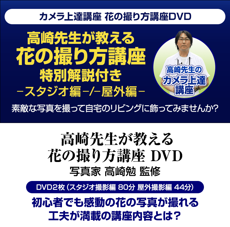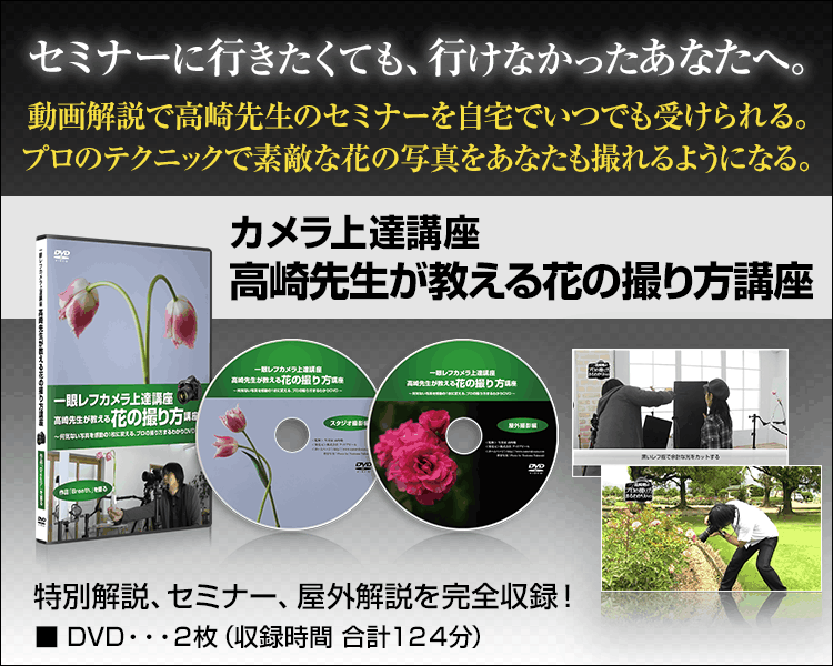 花の選び方や撮影しやすいセッティング方法、カメラの数値の設定、三脚を使った撮影方法など、 花を撮る流れをすべて動画で解説します。あなたも見て真似をして写真を撮ってみてください。きっとこれまでにない、楽しい写真が撮れるはずです。