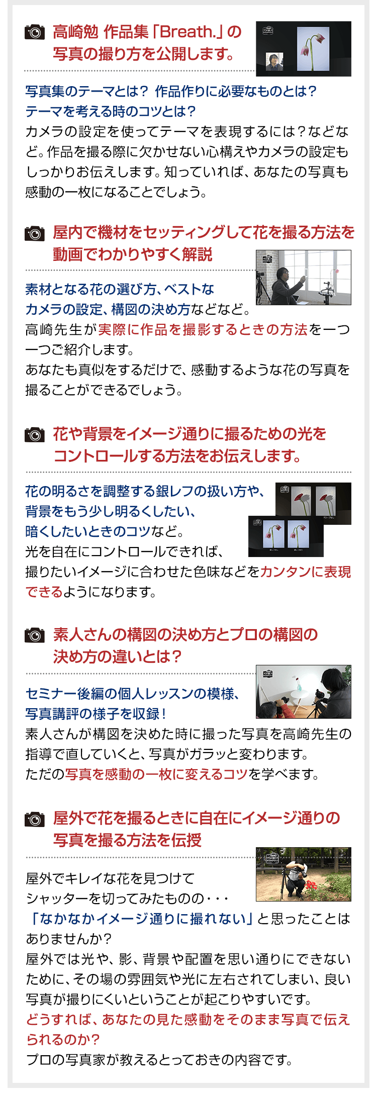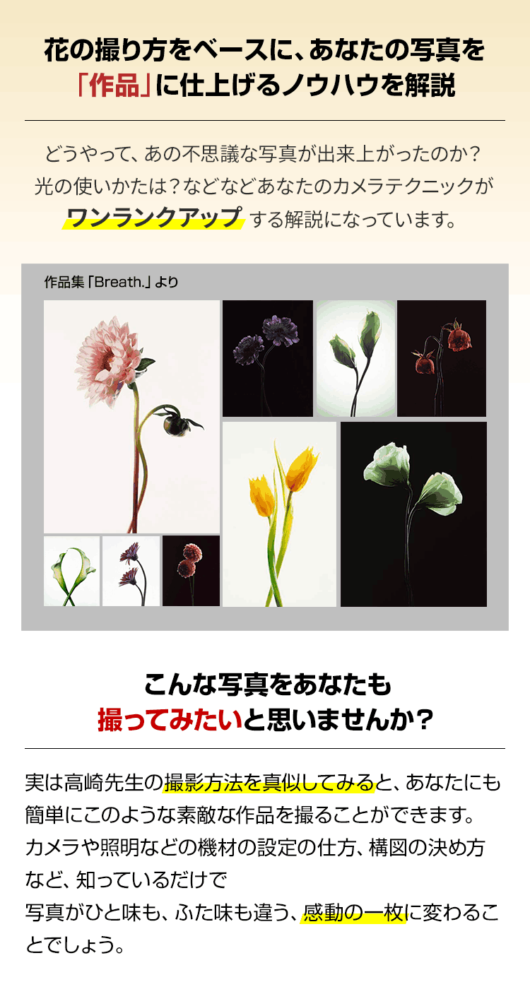 高崎先生が花を撮る時に気をつけていること、作品集「Breath.」のテーマはどこから思いついたのか? などなど、より深い質問をしてみました。「へ~そうなんだ!」と撮影の際の参考になる深いお話ばかりです。