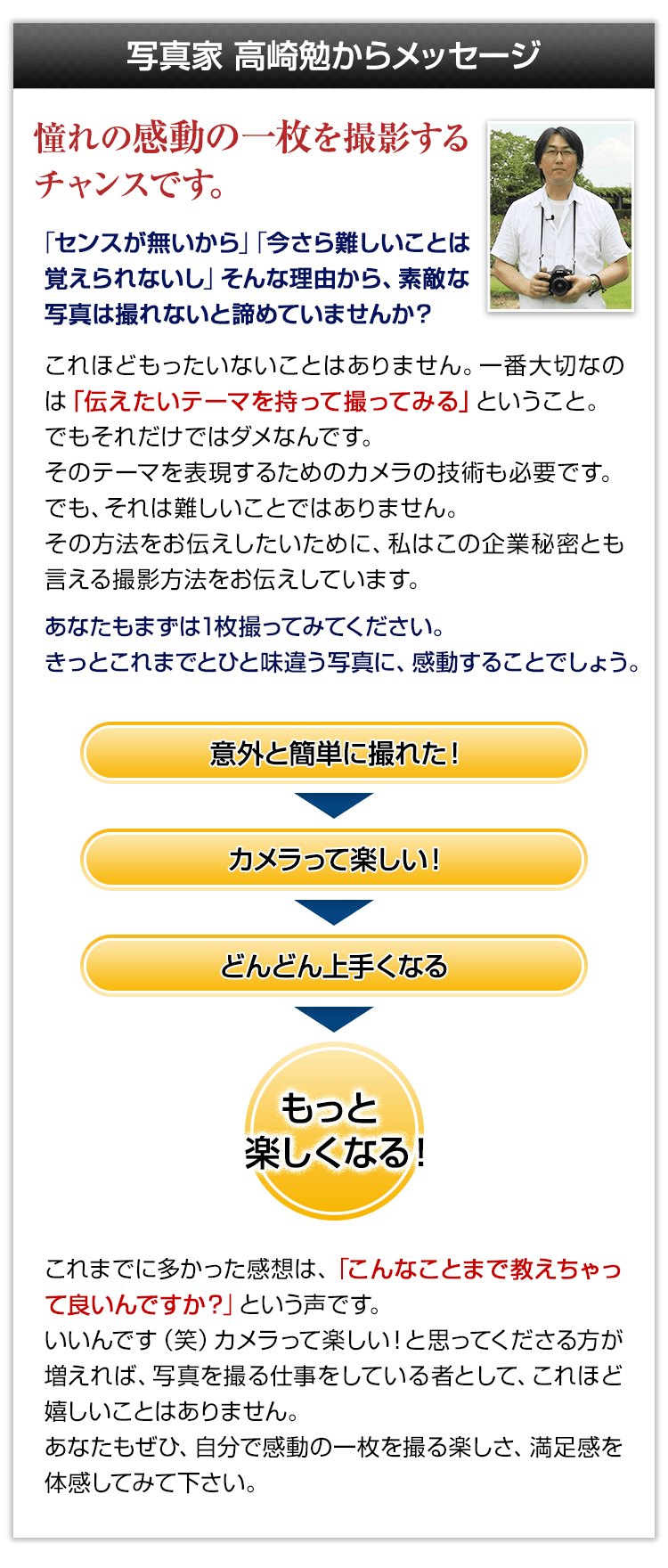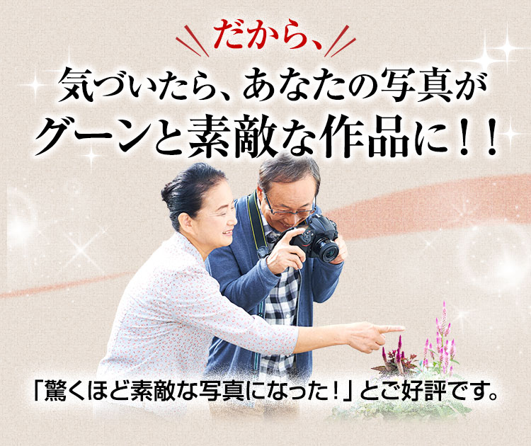 プロと素人の構図の決め方って何が違うんでしょう?その答えがわかります。 少し構図や光の当て方を変えるだけで、「いっきに作品になった!」と 参加者も感じた。 感動の一枚を撮るコツを一緒に学べます。