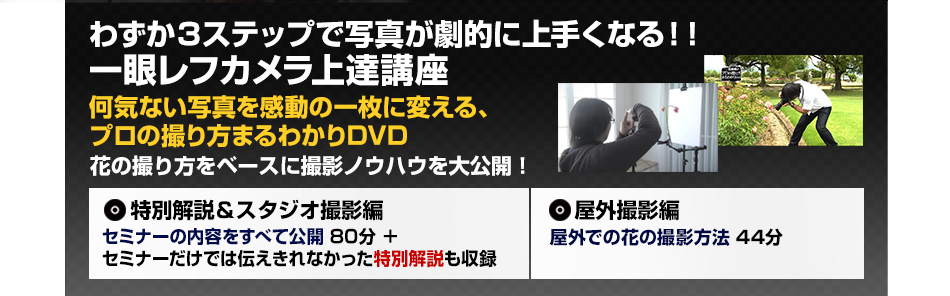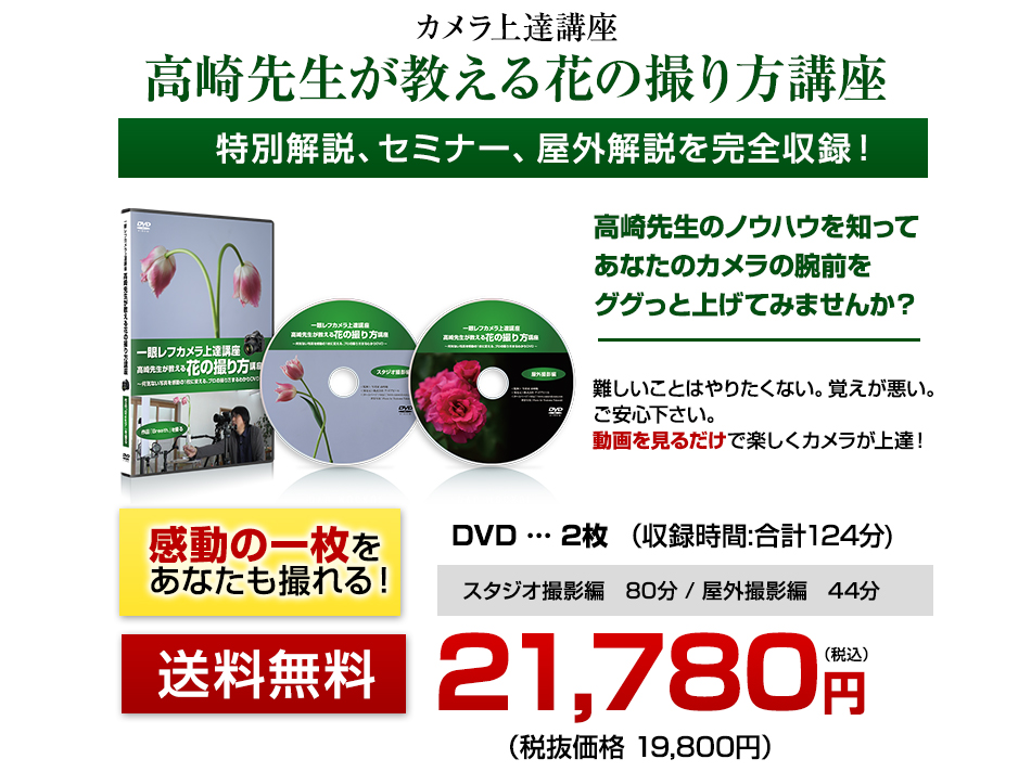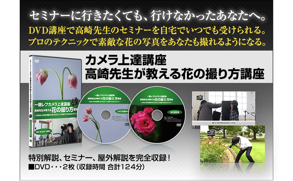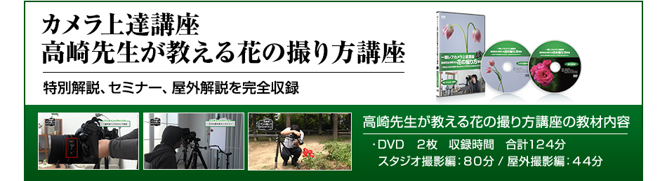 花の選び方や撮影しやすいセッティング方法、カメラの数値の設定、三脚を使った撮影方法など、 花を撮る流れをすべて動画で解説します。