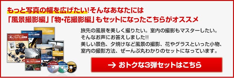 と申しますのも、第1弾の「人物撮影編」でカメラの基礎的な部分を学んで頂き、 第2弾、第3弾で風景、物や花、と撮るレパートリーを増やしていく形をとっています。