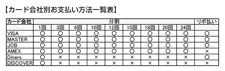 ●お支払い回数は1,3,6,10,12,15,18,20,24回が可能です。その他、ボーナス一括払いやリボ払いにも対応しています。ただし、Diners,DISCOVERカードに限り、お支払い回数は1回のみとなりますのでご了承ください。