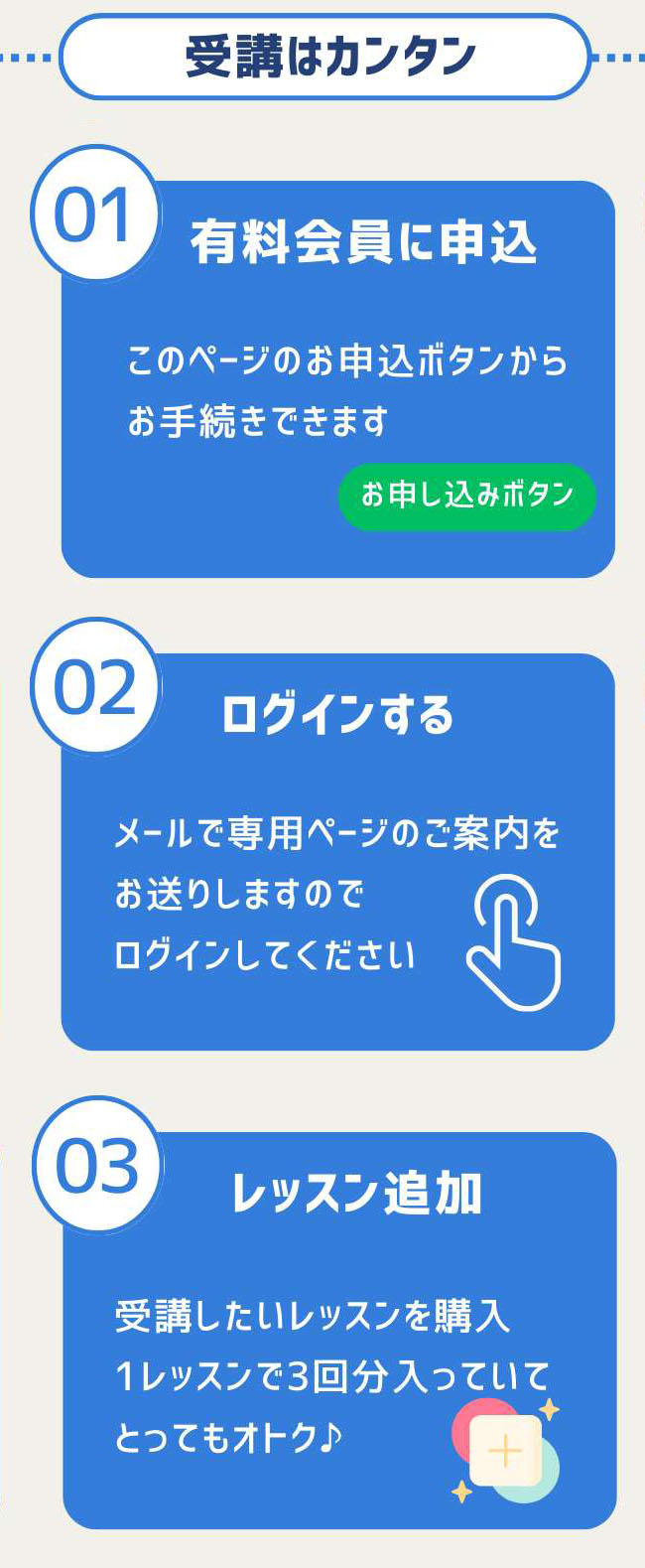 レッスンはどのくらいの頻度で増えますか?基本的には1ヶ月に1パック(レッスン3回分)追加していく予定です。が、先生のスケジュール等で難しい場合もございます。予めご了承ください。 |