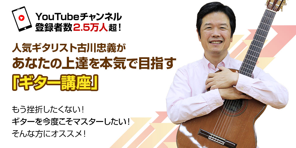一人でベンチャーズ4人分を弾いてしまったり、即興で驚きのテクニックを披露したり、 そして何よりも楽しいトークが大人気の古川忠義が、あなたのギター上達をお手伝いします!