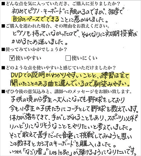 - 初めてピアノ・キーボードに触れるのですが、独学で自分のペースでできることに惹かれました。