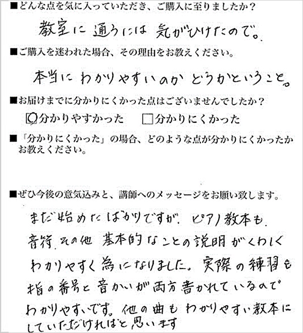 幸い嫁いだ娘のピアノがあったので、ここは田舎の豪雪地で私の仕事の関係上、冬だけは時間があるので毎日ひいています。又時間ができたらレパートリーを増やしてみたいです。素晴らしい教材をありがとうございました。