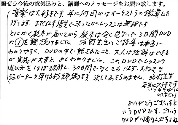 海野先生のご指導は本当にわかりやすく、DVDの中で話されたこと、大人は理解できるが実践が大変と、よくわかりました。このDVDでレッスンの進め方をほぼ理解し、30日間でなくても必ず大好きなジュピターを弾けるように頑張ります。決してあきらめません。