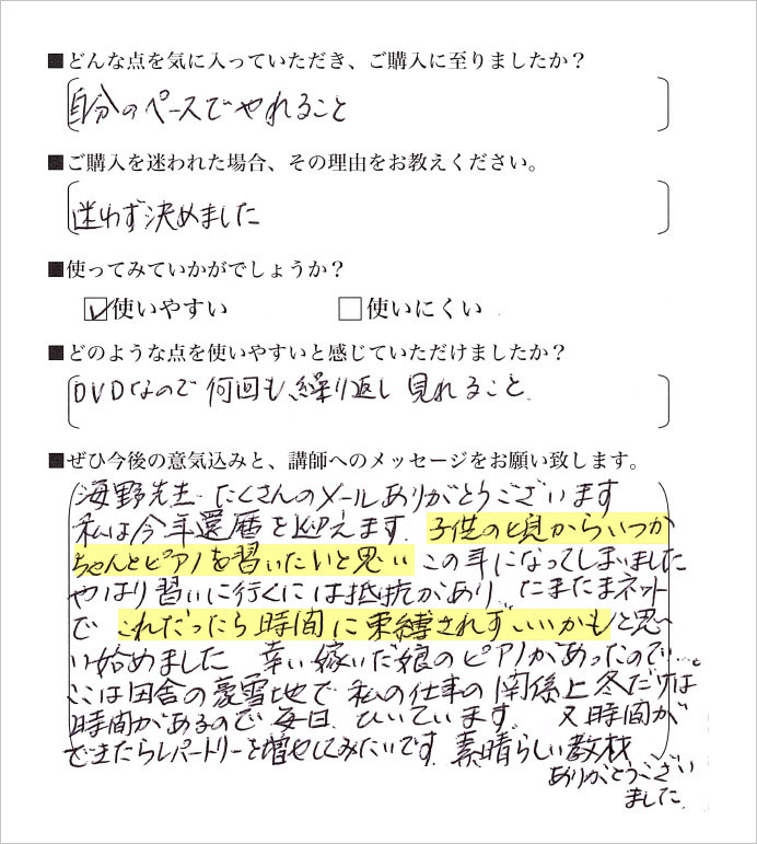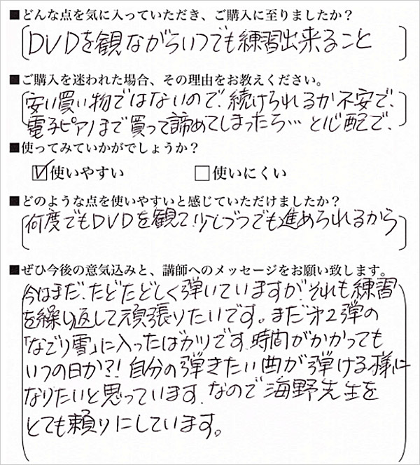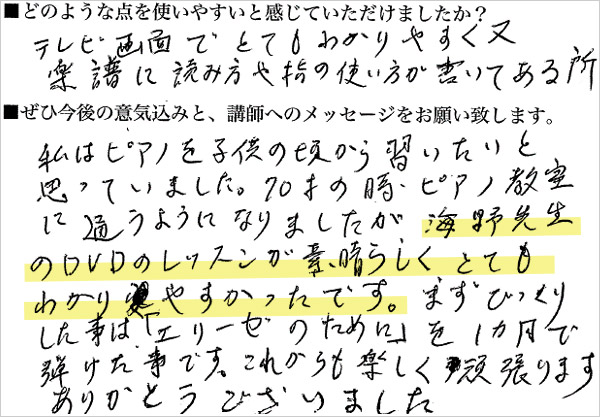 70才の時、ピアノ教室に通うようになりましたが、海野先生のDVDのレッスンが、素晴しくとてもわかりやすかったです。まずびっくりした事は「エリーゼのために」を1か月で弾けた事です。