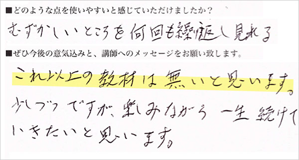 知っている曲で練習できる点。 - ぜひ今後の意気込みと、講師へのメッセージをお願い致します。