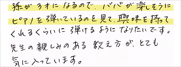 自分の弾きたい曲が弾ける様になりたいと思っています。なので海野先生をとても頼りにしています。