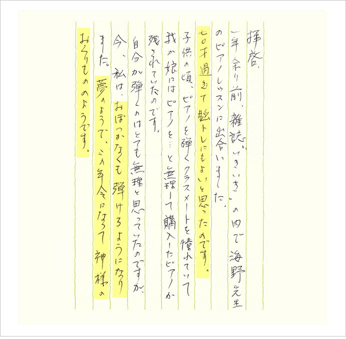 一年余り前、雑誌「いきいき」の内で海野先生のピアノレッスンに出会いました。 七十才過ぎて脳トレにもよいと思ったのです。