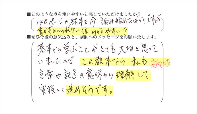 - 基本を学ぶことがとても大切と思っていましたので、この教本なら私も忘れていた言葉や記号の意味から理解して実技に進めそうです。