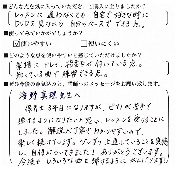 保育士3年目になりますが、ピアノが苦手で、弾けるようになりたいと思い、レッスンを受けることにしました。