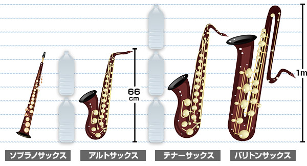 サックスには小さなものから大きなものまで、いろいろな種類があります。