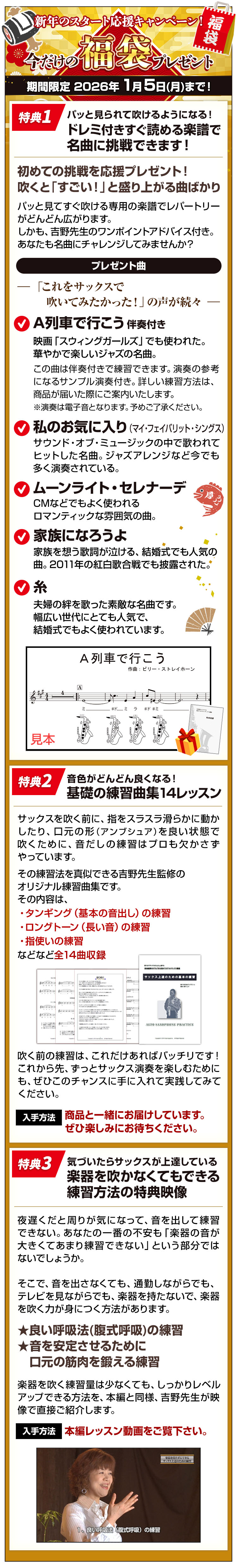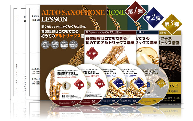 サックスの選び方、組み立て方、指使い、楽譜の読み方などです。1弾~3弾セットになりますと、基礎的な内容プラス、音楽的な内容が入ってきます。