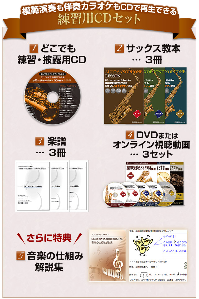 アルトサックス講座のレッスン動画に出てくる曲と同じ、全6曲。