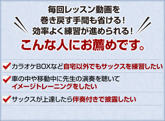吉野先生のサックス講座内で登場する、先生のお手本演奏や伴奏用のバンド演奏など。
